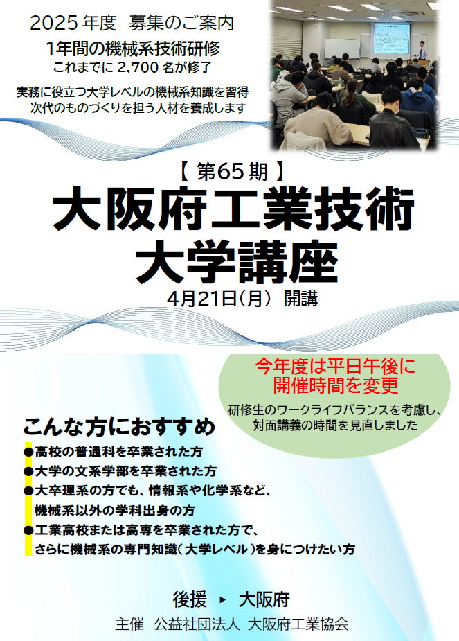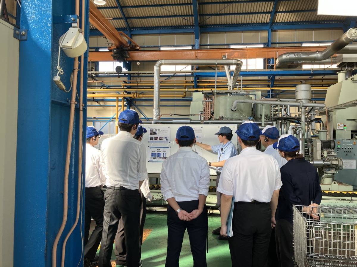 HOME > ニュース > お知らせ > 大阪府工業協会主催「大阪府工業技術大学講座」の工場見学会を実施 NEWS RELEASE ニュース 2025年10月23日お知らせ 大阪府工業協会主催「大阪府工業技術大学講座」の工場見学会を実施 「大阪府工業技術大学講座」の工場見学会を実施 2025年10月17日(金)、大阪府工業協会様主催「第65期 大阪府工業技術大学講座」の 研修生38名の皆様が、カリキュラムの一環として弊社寝屋川工場へお越しになりました。 熱処理に関する講義と工場見学のご案内を行い、皆様大変熱心に臨んでおられました。